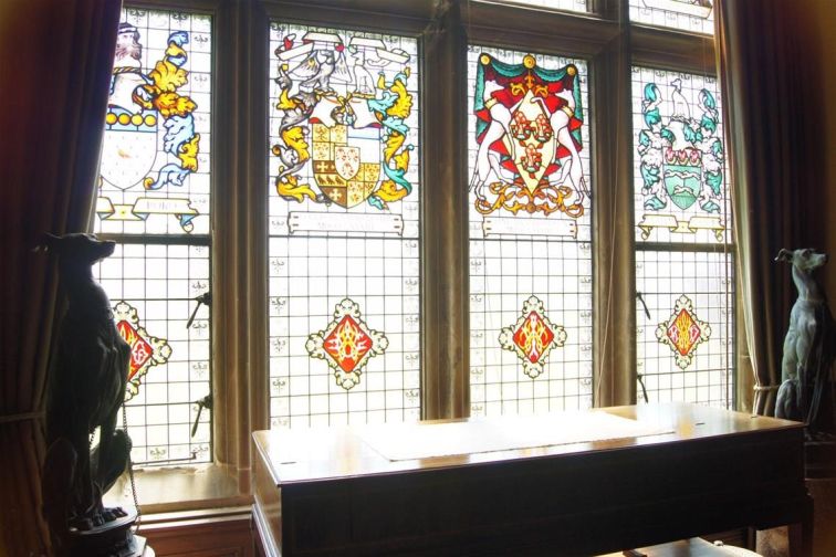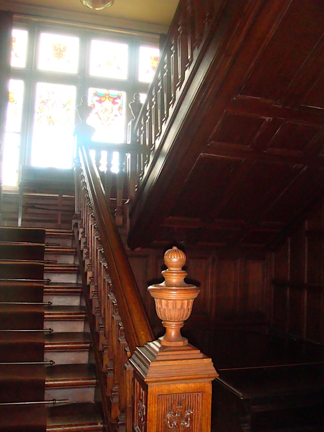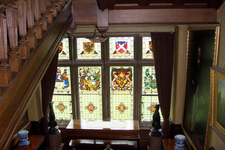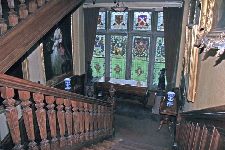 The Grand Staircase between the Ground and First Floor has Stained Glass windows that represent various parts of the Hunter family coat of arms, flags and other related features. The walls are covered in oil paintings and the carpet on the stairs is a deep red colour.