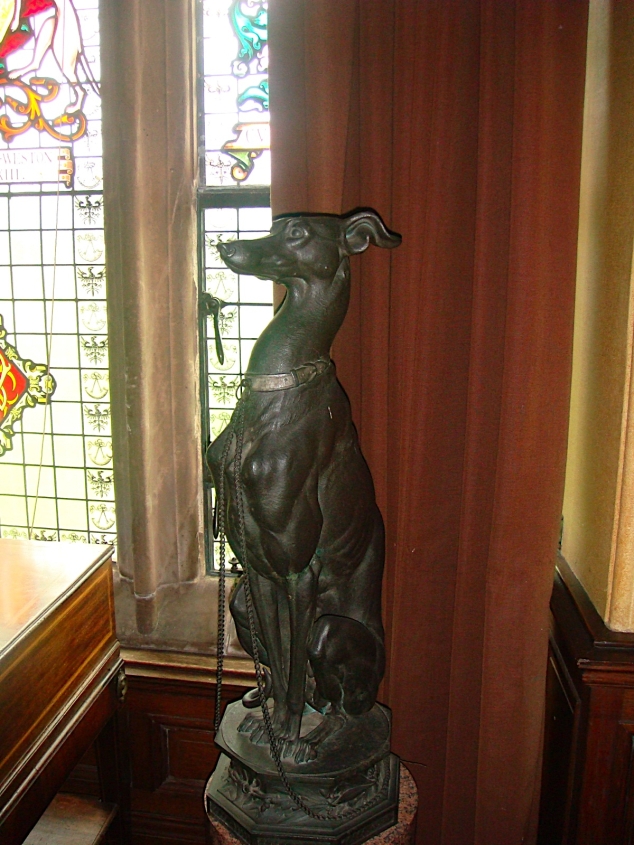 There is a harpsichord and two statues of the hunting dog on pedestals mid way up the staircase.