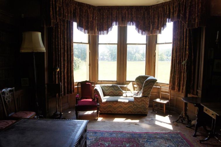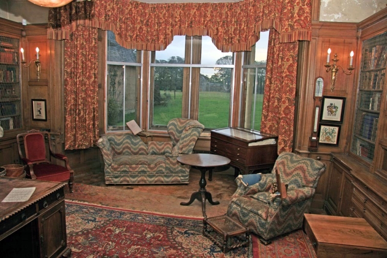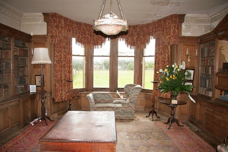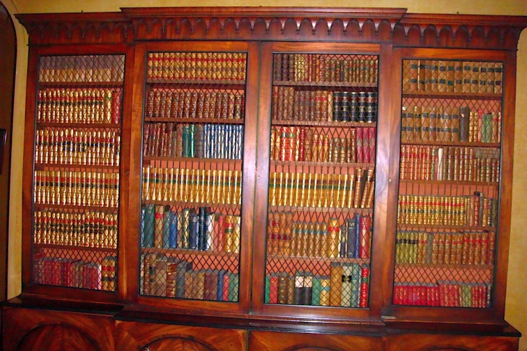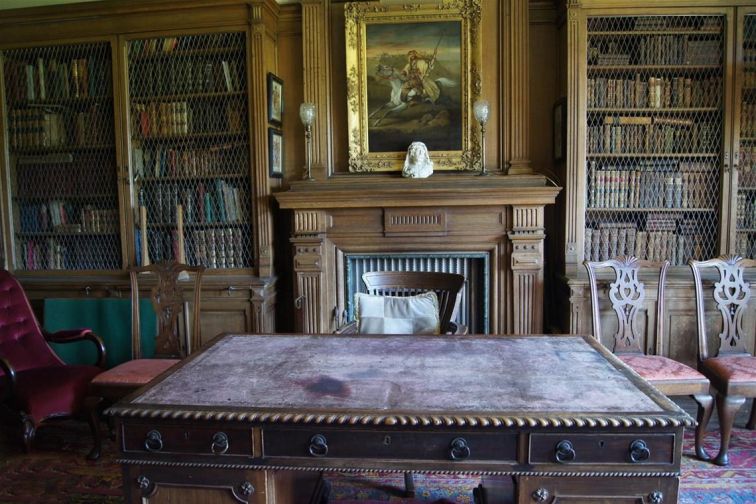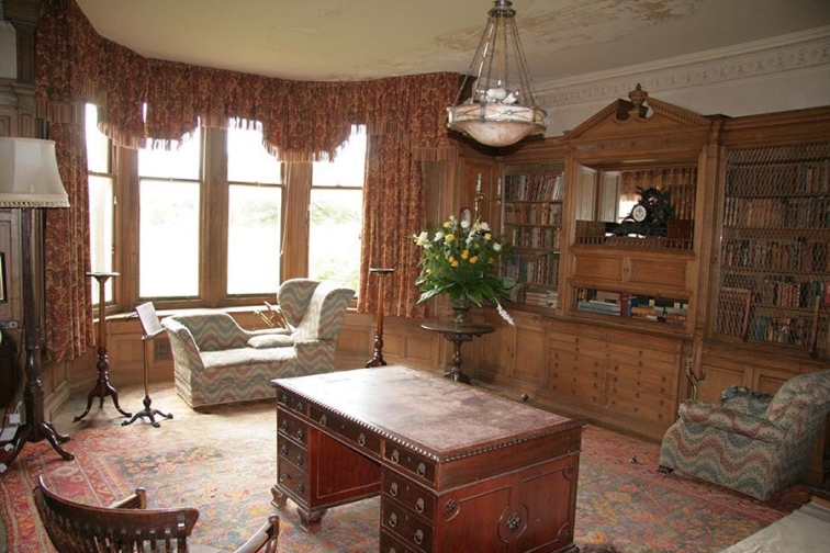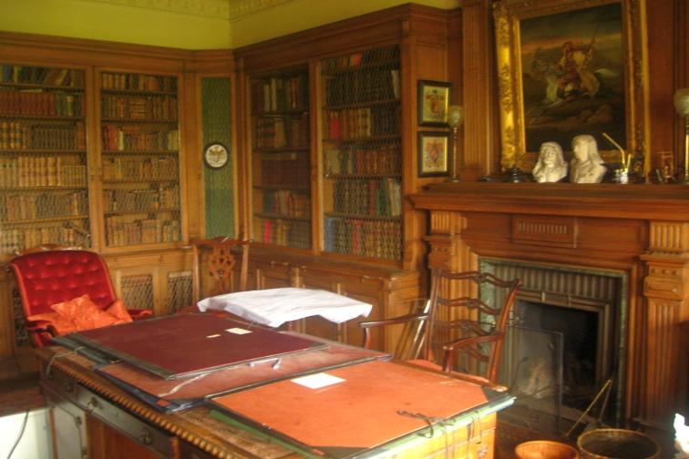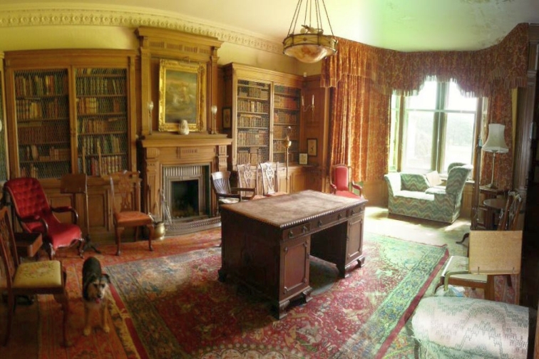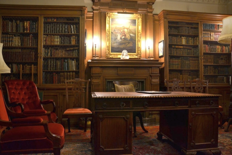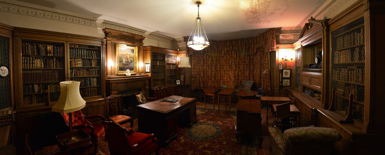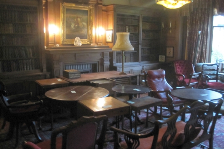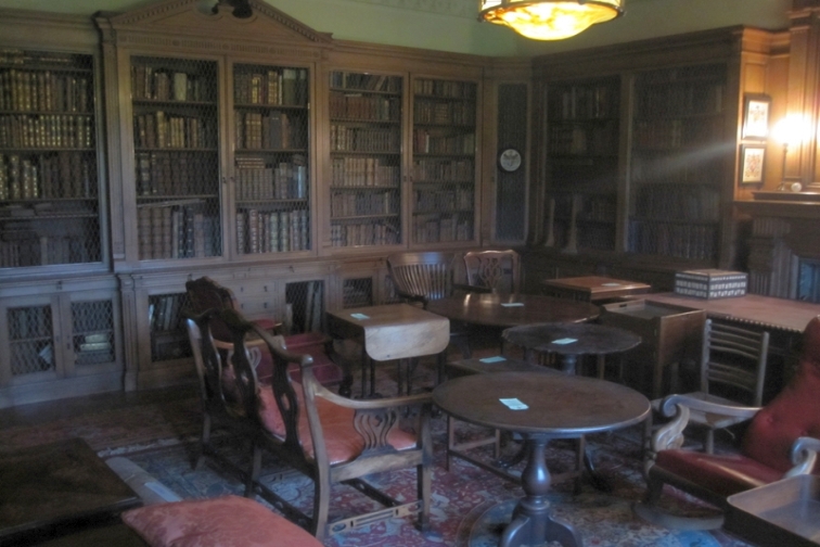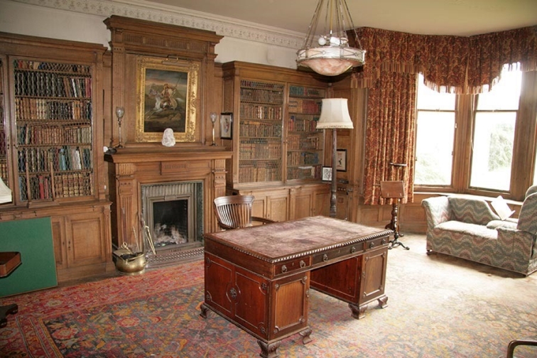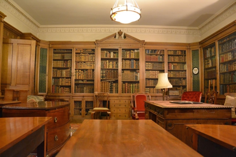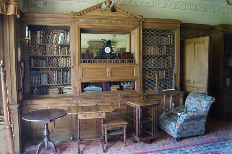 The Library is located through a secret door just off the Oak Hall. A door is located in the wall near the bottom of the Grand Staircase and opens outwards and another door is located inside that which goes to the library.