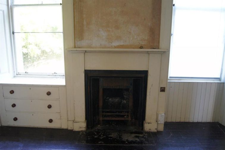 One wall has cupboards and a simple fireplace on the opposite side and drawers below each of the two windows.