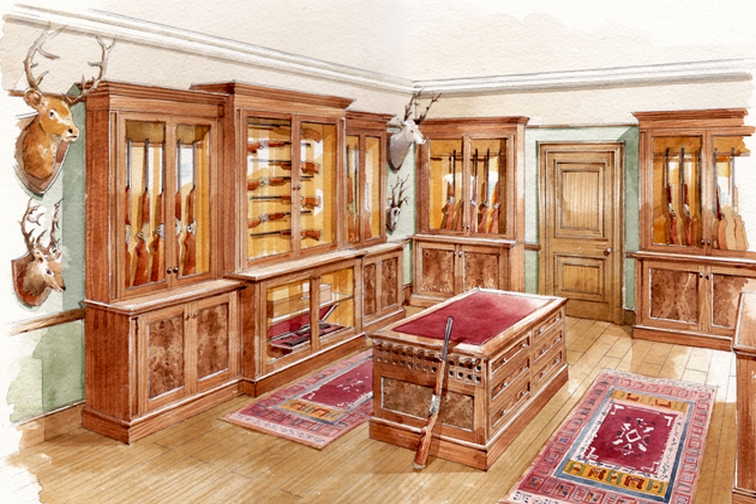 The room had similar wall cupboards as the design used in the Library, meaning that they looked like Library shelves with the wire mesh doors but instead of books they would have held the Guns.